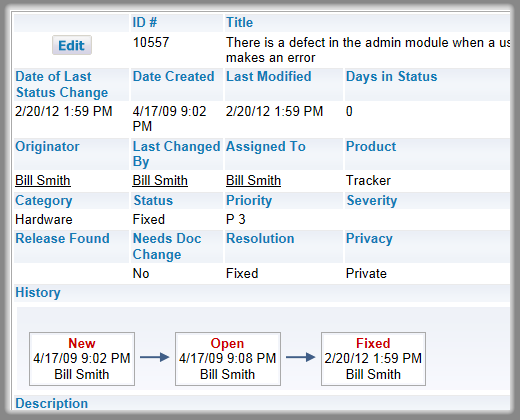 As the most comprehensive bug tracking software solution used within small companies and the world's largest organizations, this solution features comprehensive bug tracking and change management functionality, all based on the ExtraView platform. Access & administration is from any computer, anywhere on the Internet. ExtraView allows for full customization of field types, automatic e-mail notifications, user/group/field-level security, role-based workflow rules, reporting for different groups of users, built-in dashboards, attachments, a change history, project management, audit trail and much more.