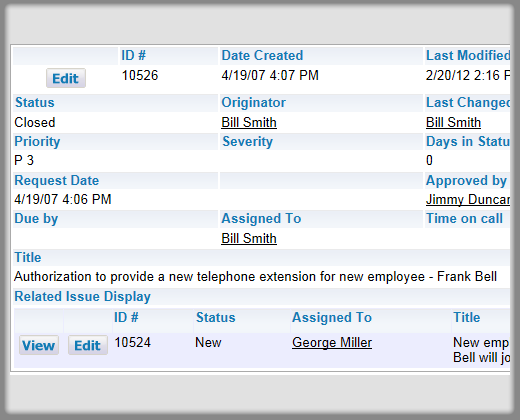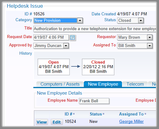 The basic principle is that assets such as computers and printers are added to an ExtraView business area named Assets and are assigned to an employee. These assets become available to issues created within the helpdesk area, so that when a new helpdesk issue is created, the entire list of assets assigned to the employee is visible.